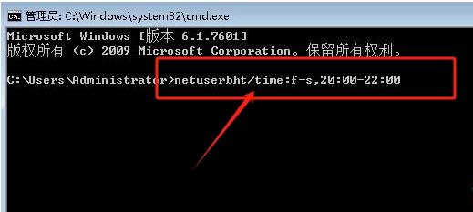 第二步:弹出cmd运行命令对话框,我们按照下图输入netuserbht/time:f-s,20:00-22:00然后回车;(这里f-s指的是周五至周六,20:00-22:00指的是晚上8点到10点,这样设置的含义是允许登录的时间为周五到周六的晚上8点到10点,)上述的时间段时孩子玩电脑的时间