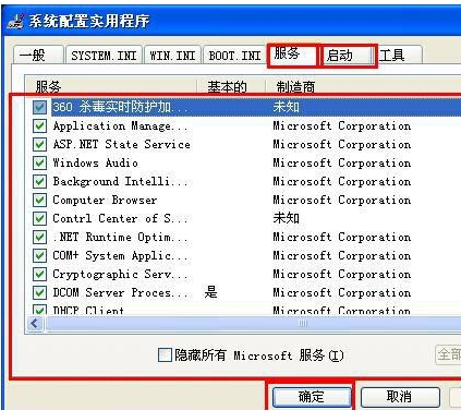 第二步:弹出windowsxp系统配置实用程序,我们点击启动和服务选项,把不需要的服务和启动程序关掉,做完之后我们重启电脑;
